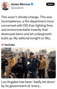 • the fires are the result of the Diversity, Equity and Inclusion (DEI) polices of the LA fire department.Of course, attacks on DEI are really just thinly veiled attacks on women and minorities.