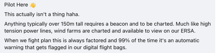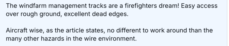 Aerial firefighters are incredibly skilled and used to working around many structures (including high voltage transmission lines). With appropriate care, working around turbines does not lead to specific threats for aircraft. As noted in the CFS guidelines: ‘Aircraft operators undertake a dynamic risk assessment of all risks to aircraft safety during an emergency incident. The presence of wind turbines, high towers and voltage transmission lines, on or near a fire ground would be considered in the incident action plan’.